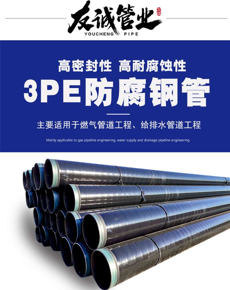 三層防腐結(jié)構(gòu)組成包括: 熔結(jié)環(huán)氧粉末底層、聚合物膠粘劑中間層和聚乙烯面層,其中環(huán)氧粉末底層的作用是形成連續(xù)的涂膜,與鋼管表面粘結(jié)、固化而提供良好的附著力,并具有很好的耐化學(xué)品性和抗陰極剝離能力;聚合物膠粘劑的作用是在環(huán)氧粉末涂料膠化之前與之融合,并與外面的聚乙烯層粘結(jié)