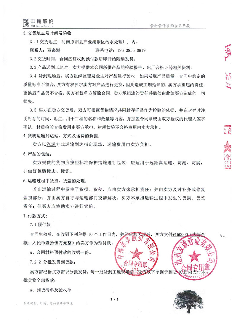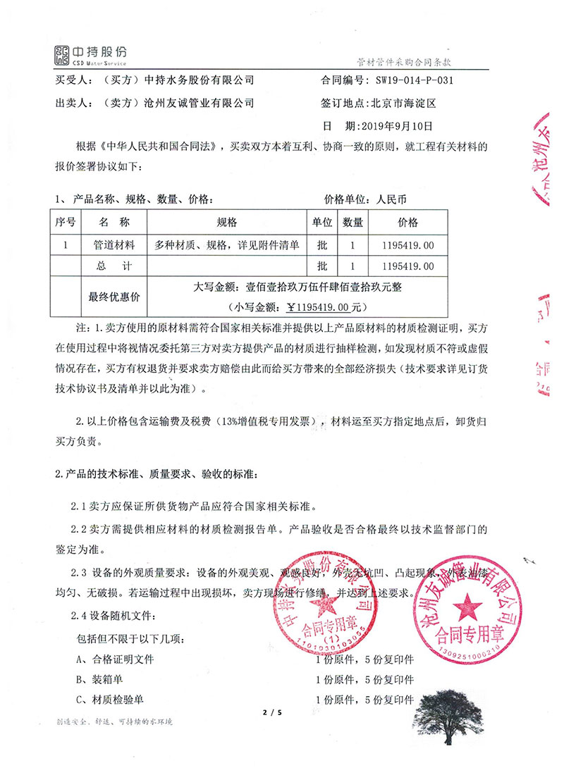 2019年9月份,友誠(chéng)管業(yè)與中持水務(wù)股份有限公司(上市公司),簽訂了原陽(yáng)縣污水處理廠項(xiàng)目的防腐螺旋鋼管合同,非常感謝貴公司對(duì)我們的信任,我們也一如即讓的做好每一支鋼管
