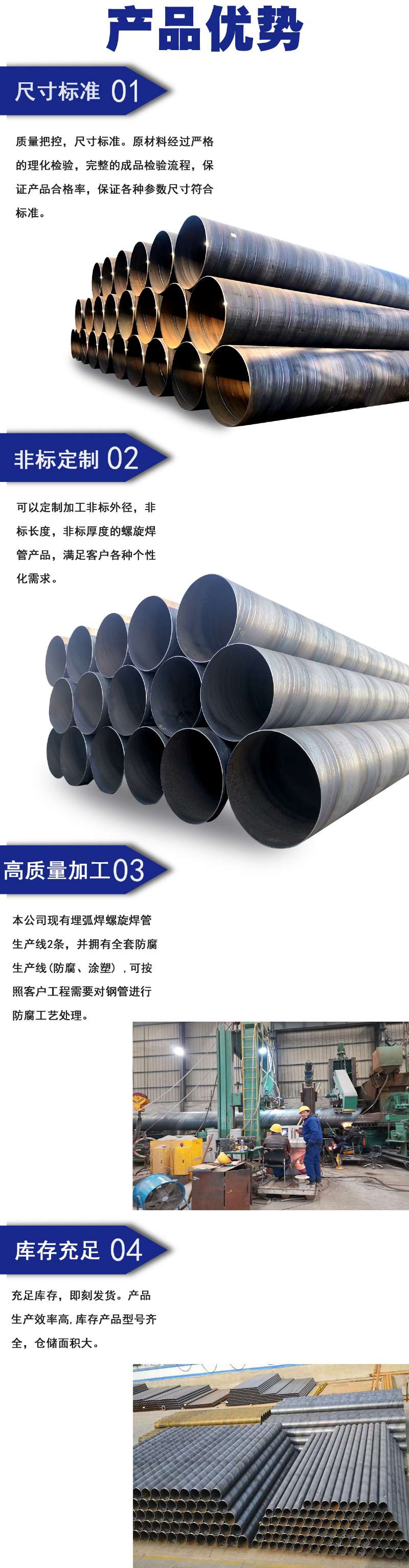 螺旋鋼管是以帶鋼卷板為原材料,經(jīng)常溫擠壓成型,以自動雙絲雙面埋弧焊工藝焊接而成的螺旋縫鋼管。